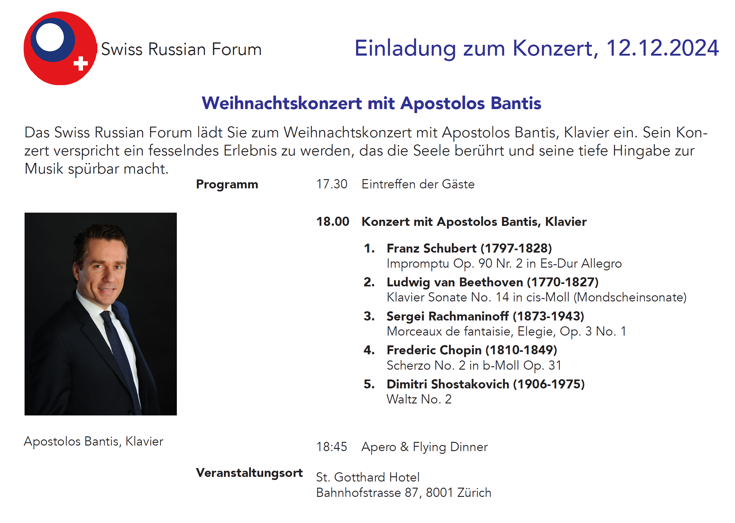 Das Swiss Russian Forum lädt Sie herzlich zum Weihnachtskonzert mit Apostolos Bantis am Klavier ein. Sein Spiel verspricht ein fesselndes Erlebnis, das die Seele berührt und seine tiefe Hingabe zur Musik spürbar macht. Zusätzlich erwartet Sie eine inspirierende Bildervernissage der Künstlerin Elena Kupreeva. Lassen Sie sich von unserem festlichen Winterprogramm verzaubern! RSVP über die Email: […]